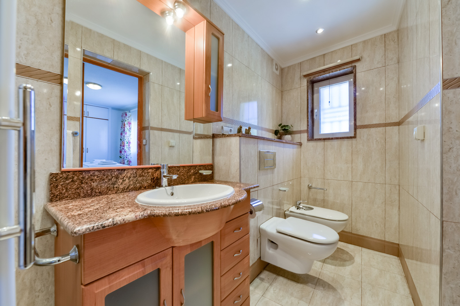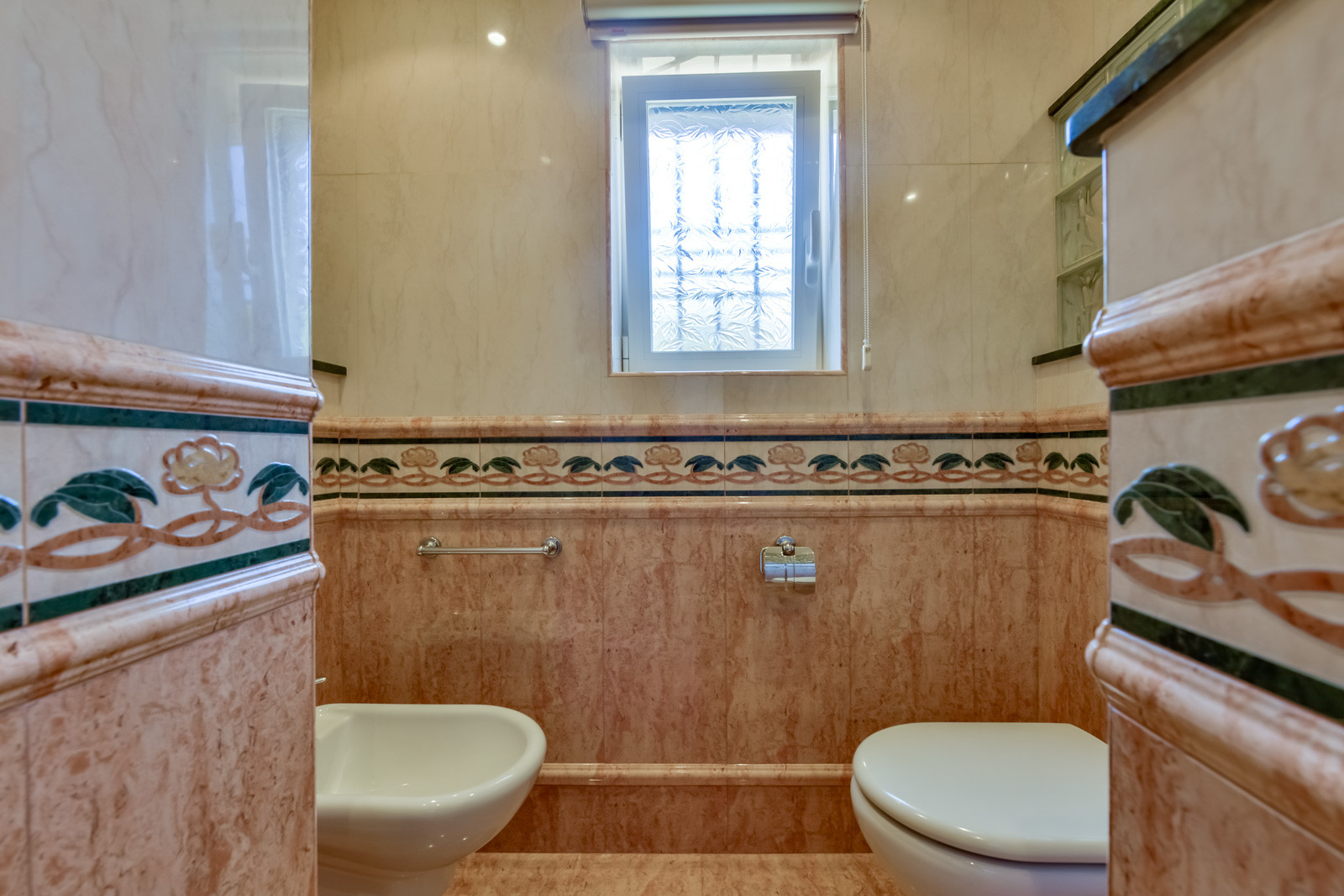 With 343 m² of living space, the villa is distributed over two floors connected by an interior staircase. On the main floor we find a comfortable living room with air conditioning, large sofa and TV to relax, a dining room, a double bedroom with double bed, air conditioning and en suite bathroom with bathtub and shower. A fully equipped kitchen and a pleasant living-dining room with a large table for 8 people and a nice window through which a beautiful natural light enters all year round. A second double bedroom with double bed and air conditioning. Going down the stairs, we access the lower floor of the villa where we find a double bedroom with double bed, air conditioning and en suite bathroom with shower, a bathroom with shower and the fourth bedroom with air conditioning and double bed.