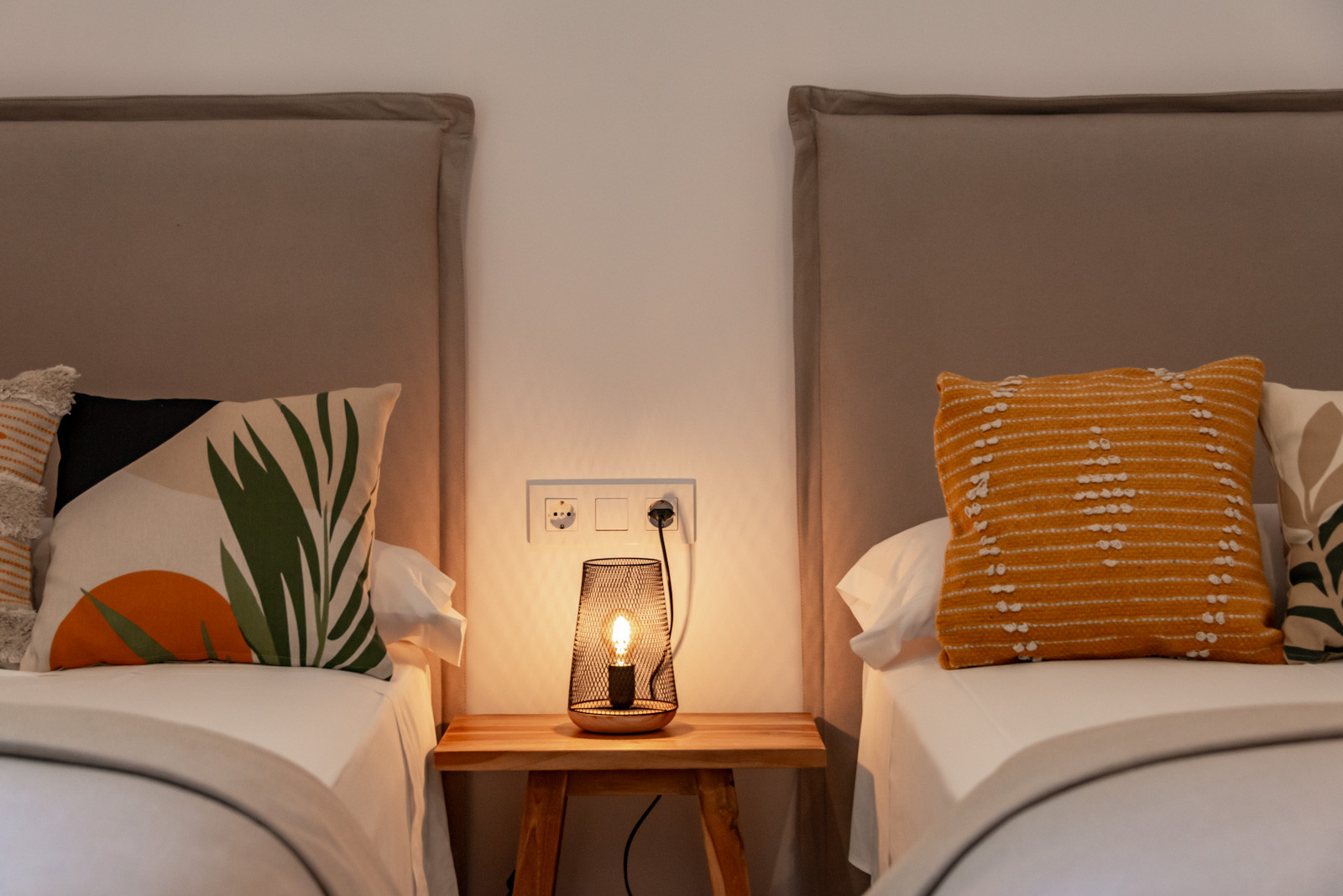 On the lower floor we find the second flat with an open plan living room, with sofa and large tv, air conditioning, table and a fully equipped kitchenette. A bedroom with double bed and air conditioning, a bathroom with shower and a bedroom with two single beds and air conditioning.