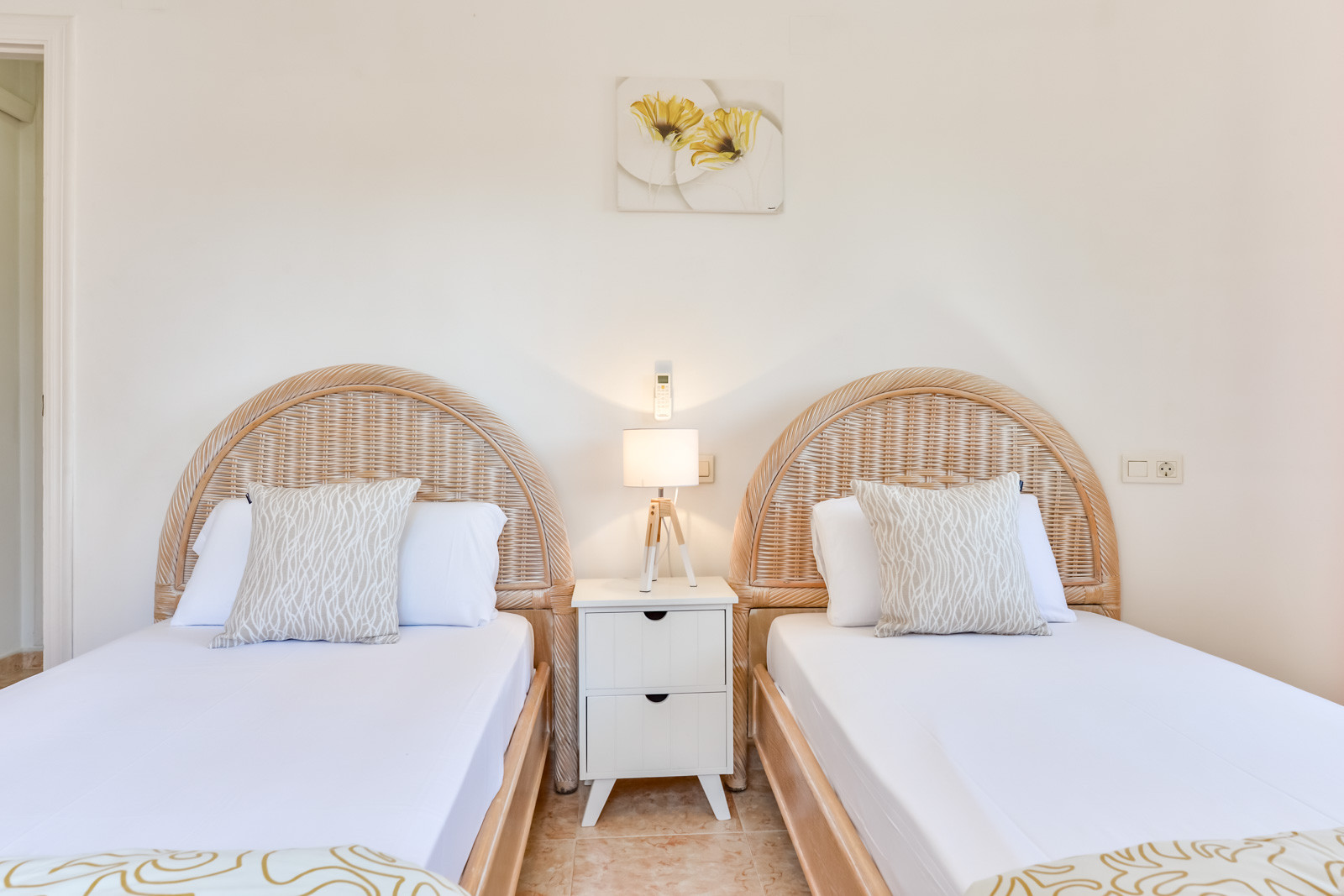 With 150 m² of housing, the villa is distributed over two floors connected by an internal staircase. On the main floor we find a pleasant living room with air conditioning, sofa and TV area to relax, and a dining area with a nice table and chairs for 6 people. Next to the living room we find an open and fully equipped kitchen that allows you to enjoy the company of your family members while you are cooking, or preparing a delicious coffee in the morning. A room with two single beds and air conditioning, a full bathroom with a bathtub and a second bedroom with a double bed and air conditioning, and another a full bathroom with a shower. Going up a pleasant staircase we reach the upper floor where we find a double room with air conditioning, with an en suite bathroom with shower and a private terrace with a small table and two chairs to relax looking at the stars during the night. The pool can be heated on request, at an extra cost per night.
