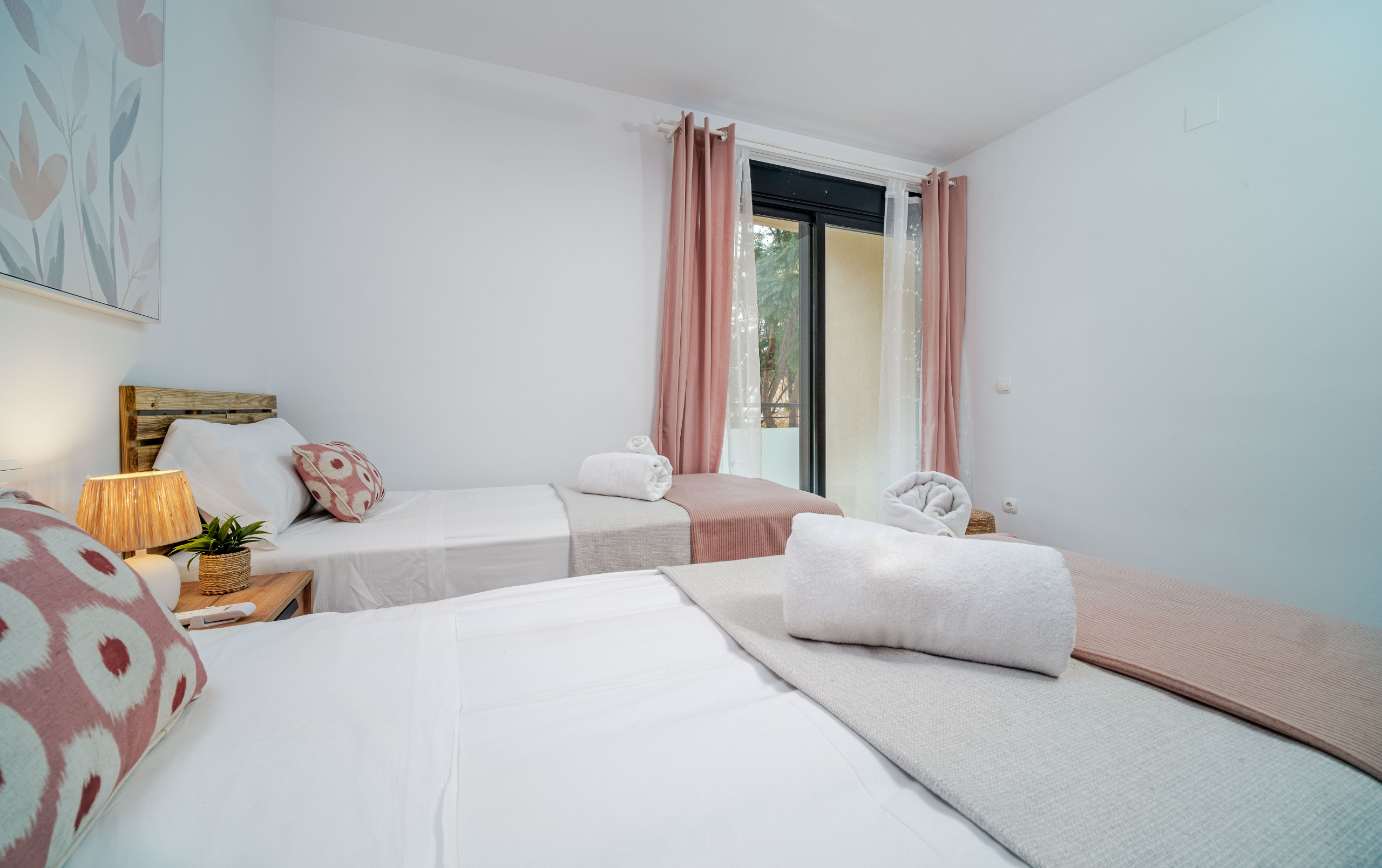 Au premier étage se trouve une chambre avec un lit de matrimonial (150x200), une deuxième chambre avec deux lits individuels (90x200) et une salle de bain avec douche. Au deuxième étage, il y a une autre chambre avec un lit de matrimonial (150x200), une chambre avec deux lits individuels (90x200) et une salle de bain avec baignoire. Toutes les chambres disposent d'un balcon, de stores et de ventilateurs de plafond.