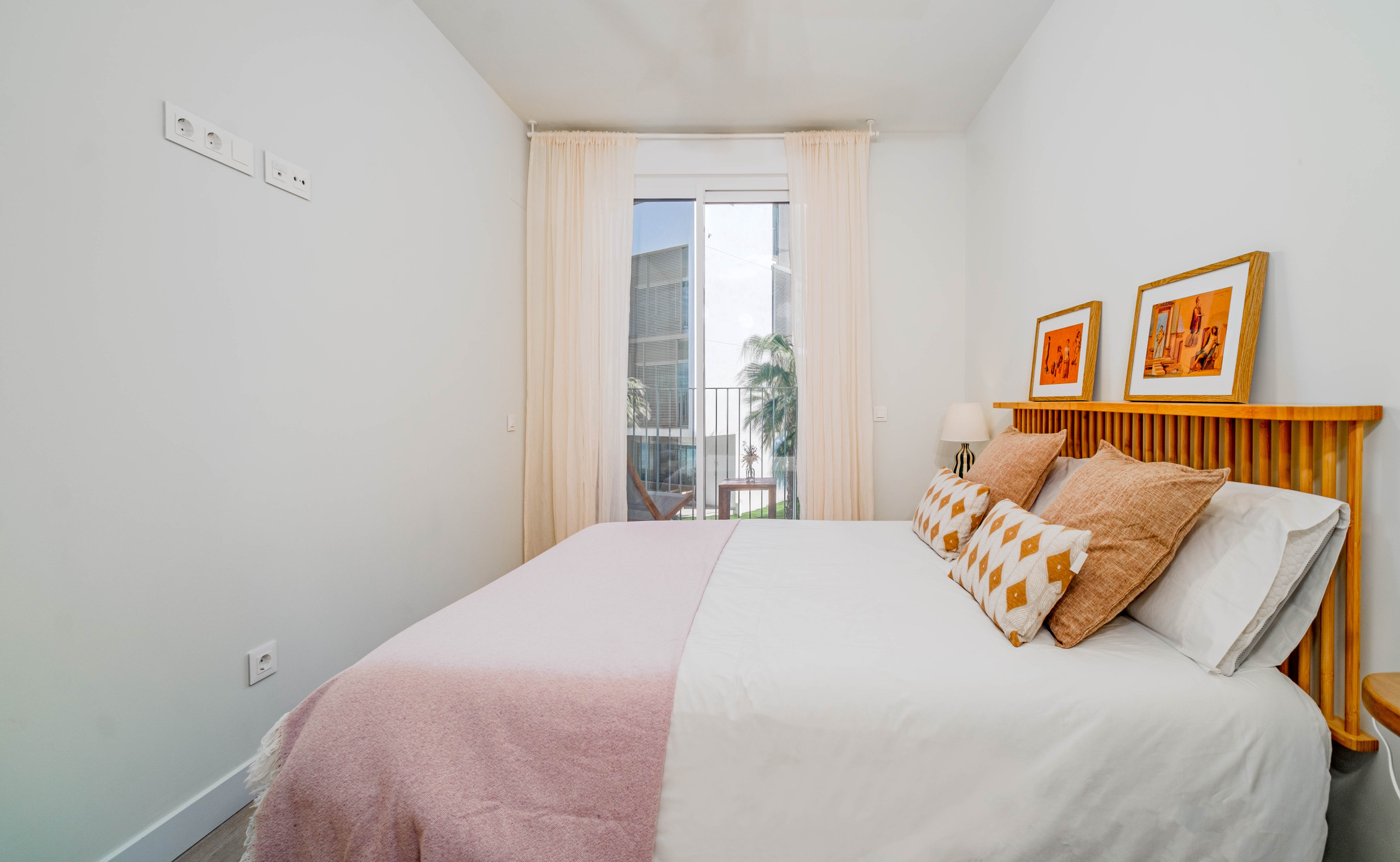 L'appartement dispose de deux chambres accueillantes, toutes deux avec des placards intégrés et un accès à l'extérieur. La chambre principale dispose en outre d'une salle de bain attenante, tandis que le logement offre une deuxième salle de bain complète avec douche, garantissant confort et intimité.