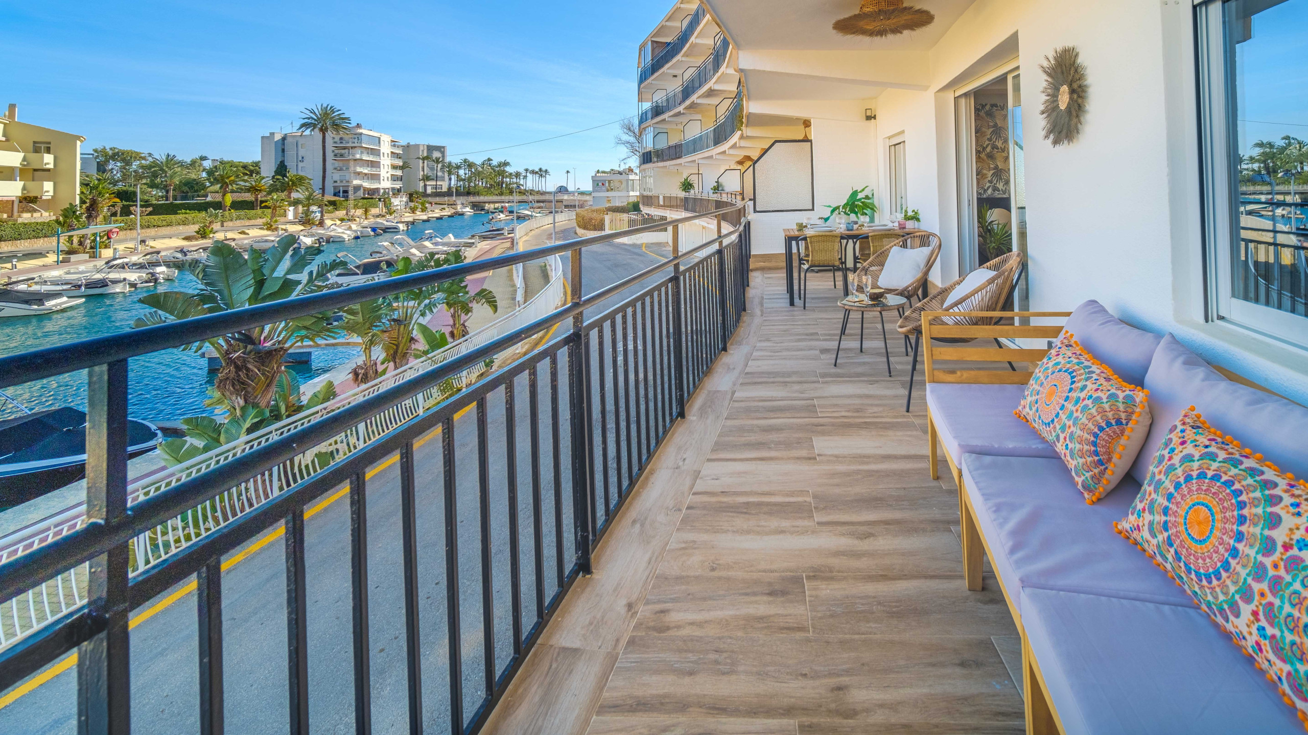 Le salon-salle à manger dispose d'un espace salon agréable et d'un accès direct à la terrasse, depuis laquelle on profite de belles vues sur le canal de Nou Fontana. La terrasse est équipée d'une table extérieure et de chaises, ainsi que d'un canapé extérieur, créant un espace parfait pour se détendre ou profiter de repas en plein air.