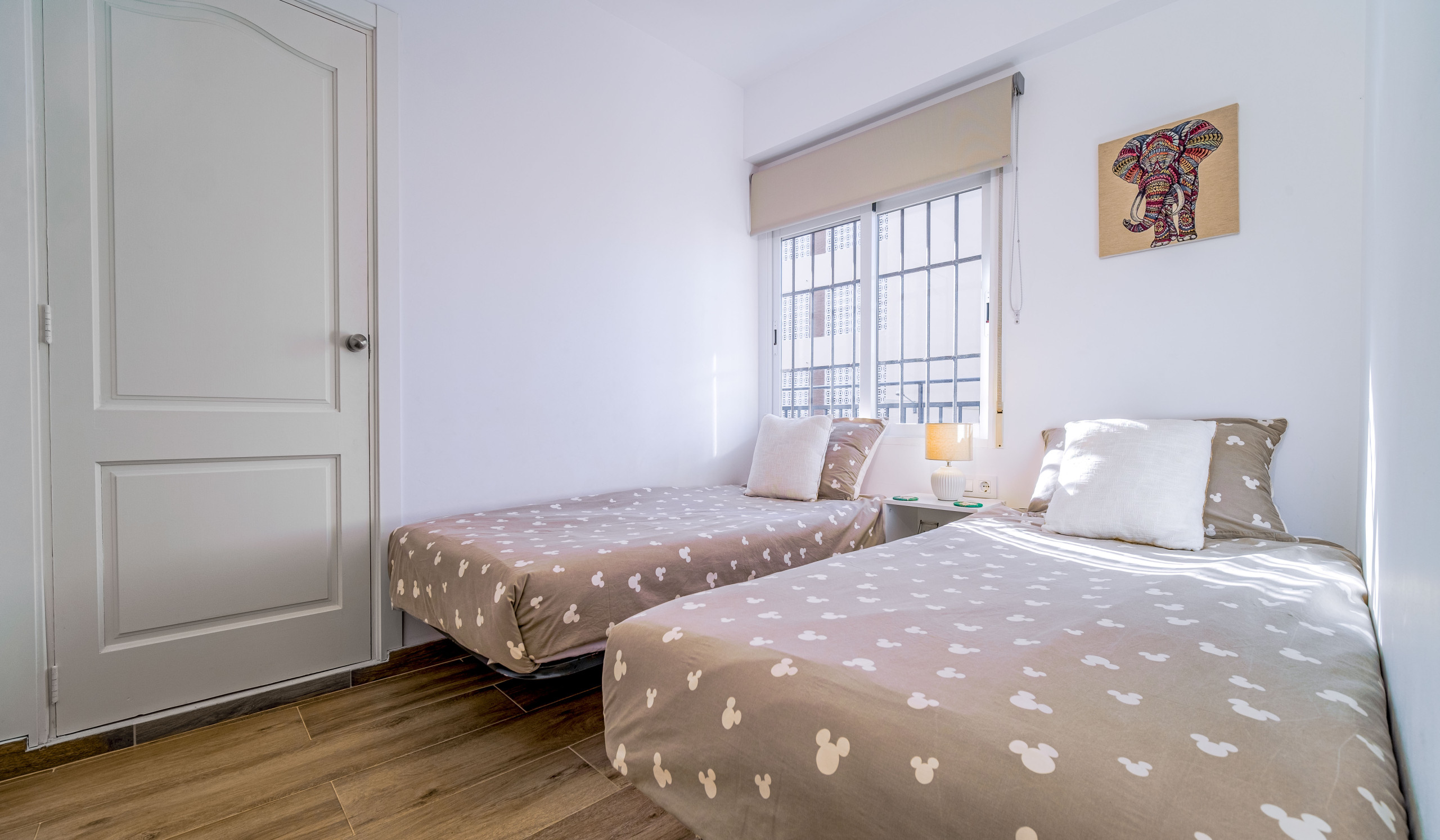 La chambre principale dispose d'un lit double, de placards intégrés et d'un accès direct à la terrasse. La deuxième chambre comprend deux lits individuels, tandis que la troisième offre un pratique lit superposé, idéal pour les enfants.