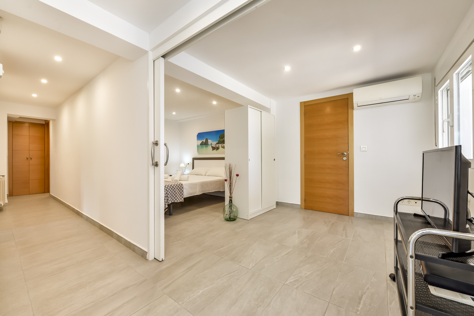 À l'étage inférieur, le deuxième appartement comprend un salon ouvert, avec canapé et grande télévision, air conditionné, table et kitchenette entièrement équipée. Une chambre avec lit double et air conditionné, une salle de bains avec douche et une chambre avec deux lits simples et air conditionné.