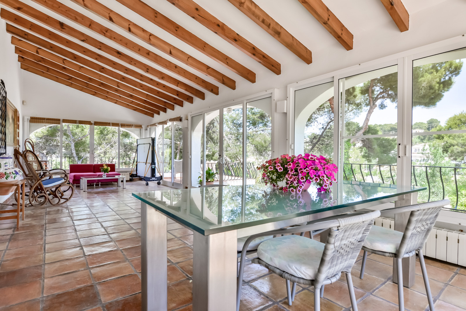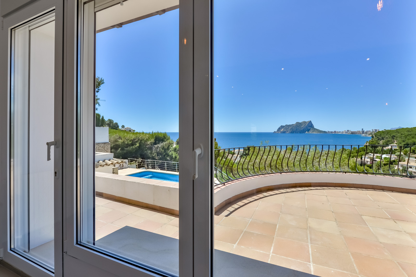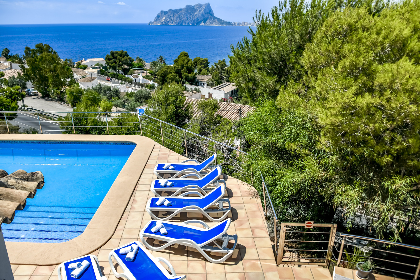 Avec un terrain de 1 144 m2, la villa dispose de plusieurs terrasses pour les repas en plein air. Depuis la terrasse du dernier étage, un escalier en colimaçon mène à un joli solarium avec des canapés d'extérieur pour se détendre et profiter de la vue sur la mer depuis un endroit privé et très calme, parfait pour les soirées d'été. La piscine est équipée de chaises longues, d'une douche extérieure et d'un porche couvert. Barbecue à gaz et vaste espace extérieur pour plusieurs véhicules à l'intérieur du terrain.