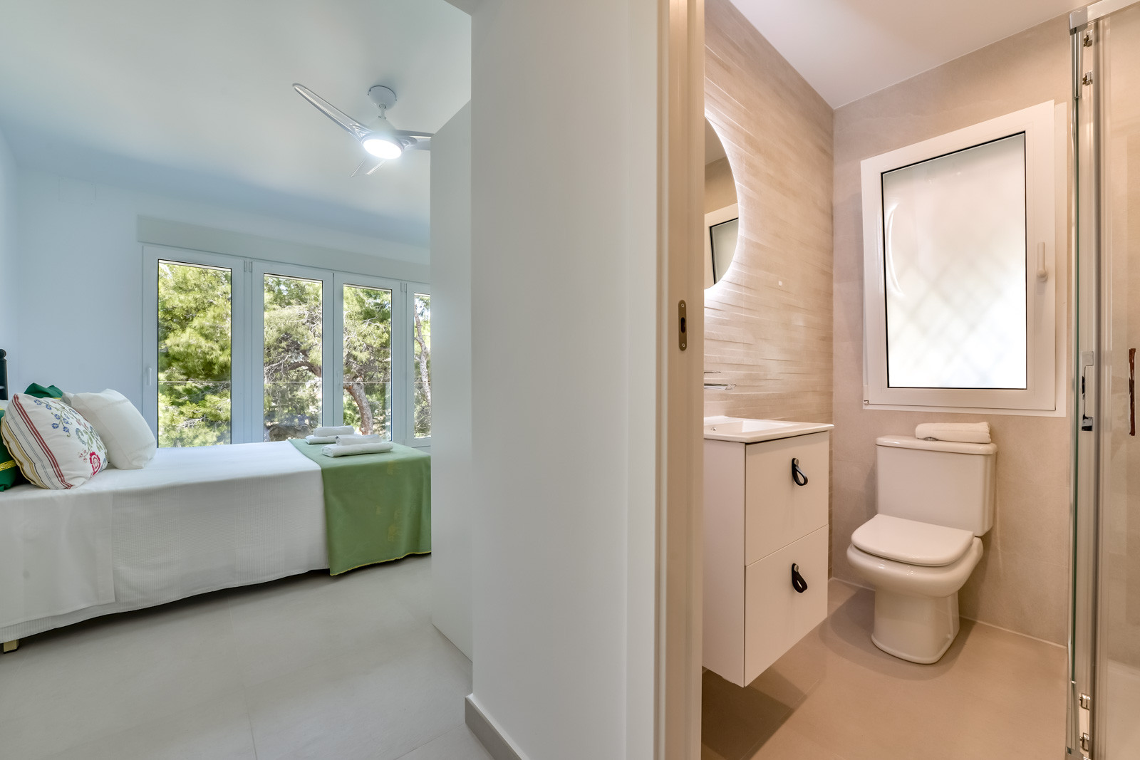 Avec 360 m², et de belles vues sur la mer, la maison est distribuée en deux étages indépendants communiqués par un large et confortable escalier extérieur. Au premier étage ou étage principal, on trouve une cuisine neuve et entièrement équipée qui mène au salon-salle à manger et à l'espace TV avec canapé, climatisation et accès à une grande terrasse avec une table pour 12 personnes et de belles vues sur la mer. Au même étage, on trouve une salle de bains complète avec douche, une chambre avec deux lits simples, télévision et air conditionné, une deuxième chambre avec télévision, air conditionné et deux lits simples. Une troisième chambre avec lit double, salle de bains attenante avec douche, télévision et air conditionné et une quatrième chambre avec lit double, et air conditionné et télévision.