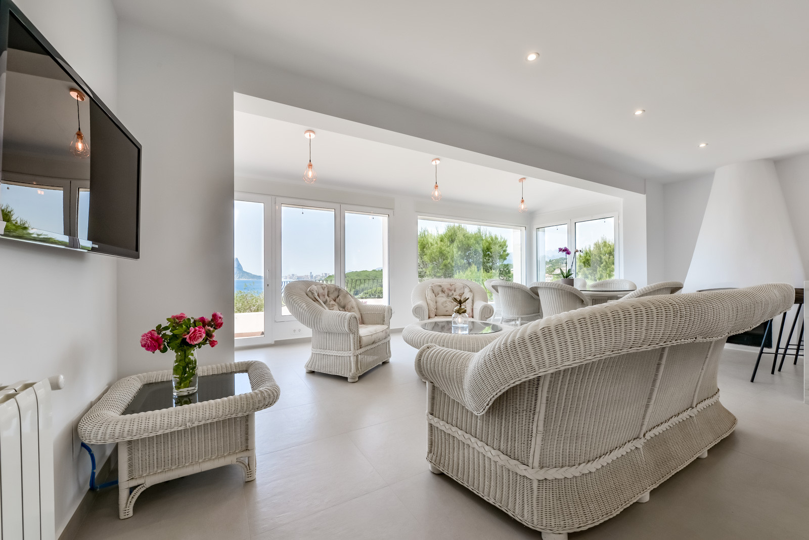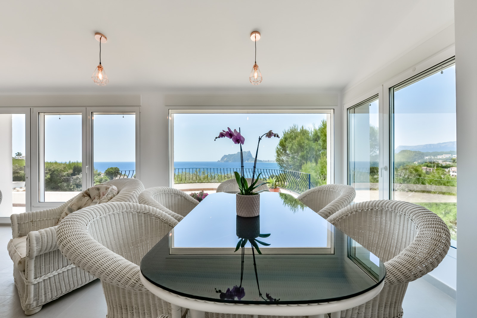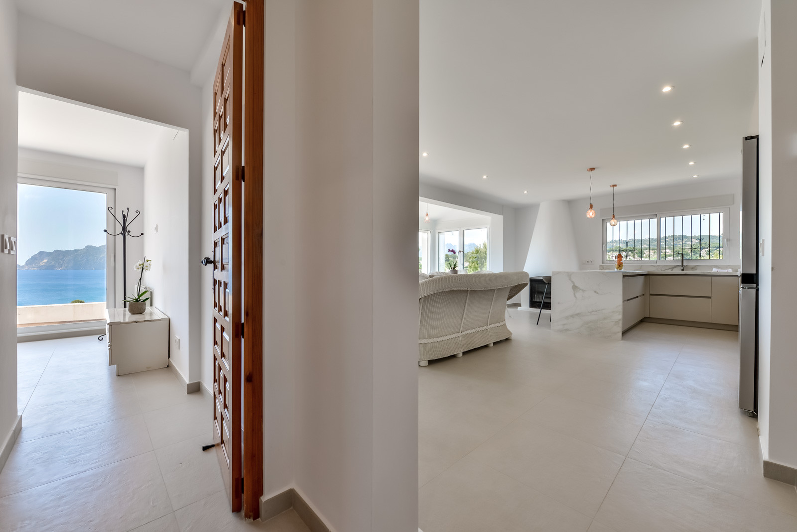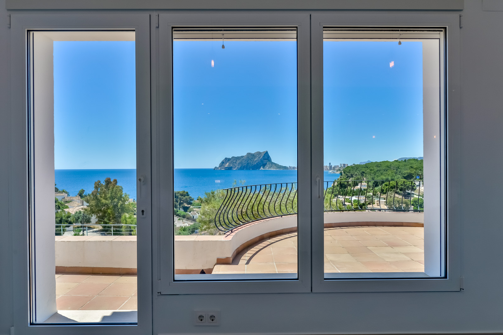 Au rez-de-chaussée se trouvent une chambre à coucher avec lit double, climatisation et salle de bain attenante avec douche, une deuxième chambre à coucher avec deux lits simples et climatisation et une troisième chambre à coucher avec lit double et climatisation. Une salle de bain complète avec douche, une cuisine entièrement équipée avec plaques de cuisson à induction, climatisation et accès à la terrasse. Pour accéder à l'étage supérieur, il faut emprunter une volée de marches à l'extérieur, et l'on trouve une cuisine ouverte sur le salon avec une vue imprenable sur la mer et le Peñon de Ifach. Une chambre avec deux lits simples et climatisation, une salle de bain avec douche, une autre chambre avec lit double et climatisation, une salle de bain avec douche, et une terrasse avec de belles vues sur la mer. Une chambre avec un lit double, une salle de bain attenante avec douche, l'air conditionné et l'accès à une belle terrasse.
