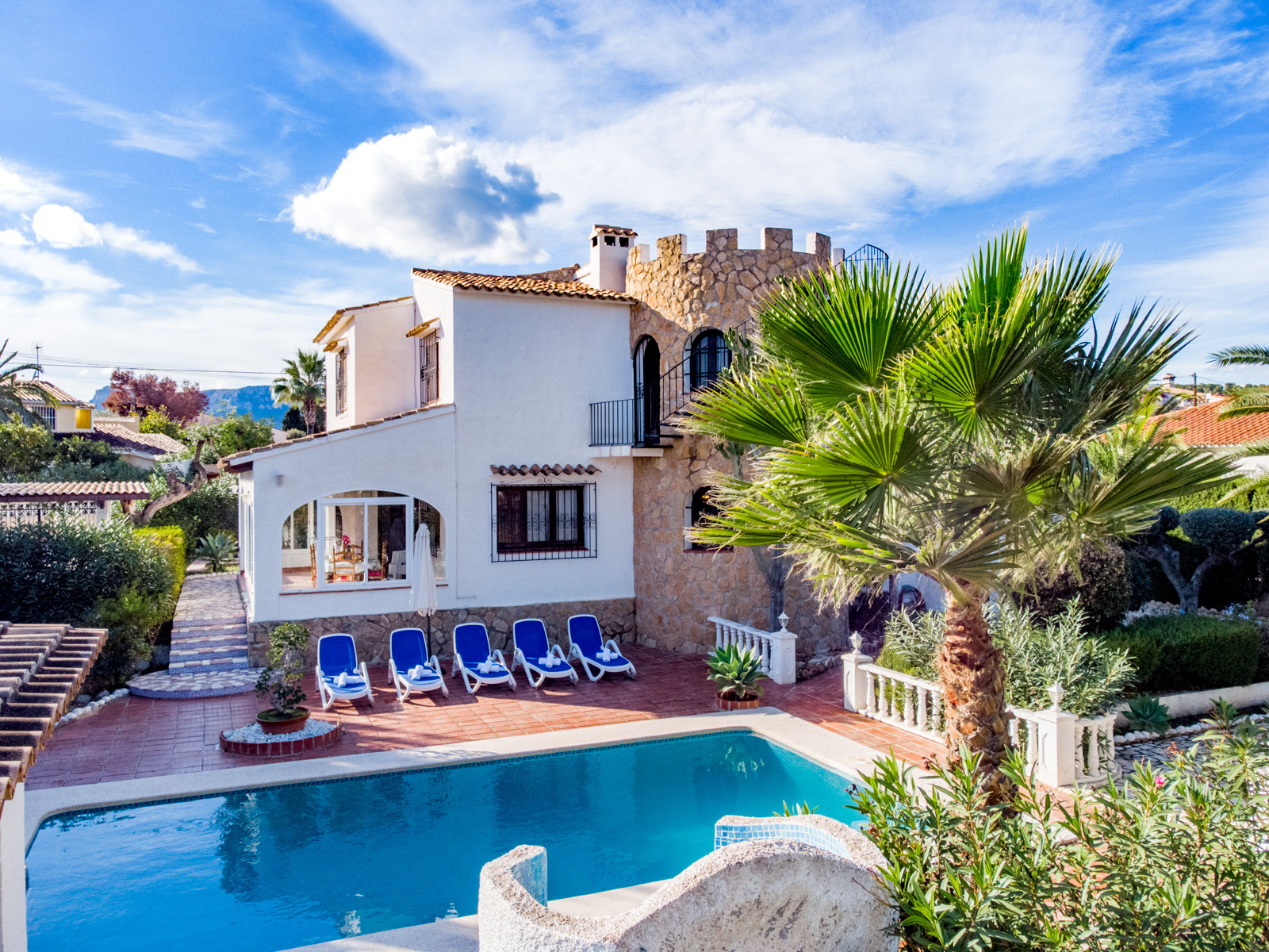 Avec 1 424 m2 de terrain, la villa dispose de plusieurs terrasses et d'une chambre d'invités face à la piscine avec un lit double, la climatisation et une salle de bain complète avec douche. Une piscine avec des escaliers en maçonnerie pour y accéder, et une zone de chaises longues pour prendre le soleil. La villa dispose de 3 places de stationnement à l'intérieur du terrain et d'une plaque de cuisson à gaz pour cuisiner à l'extérieur.