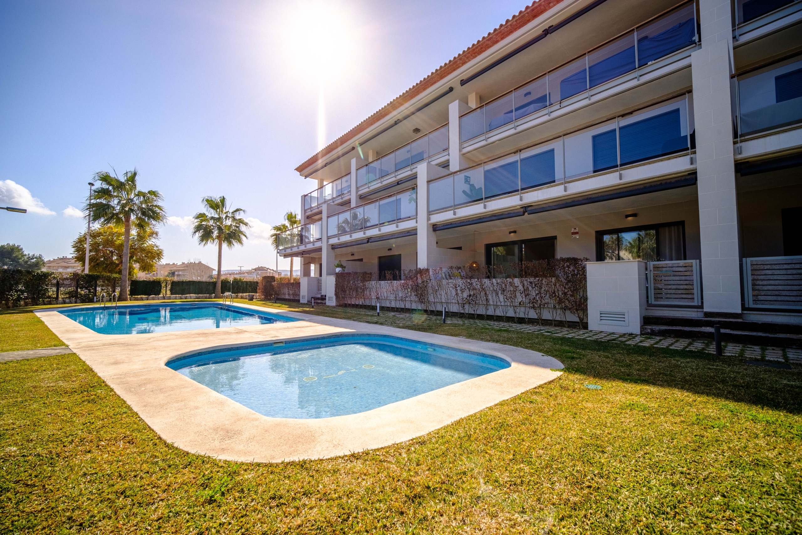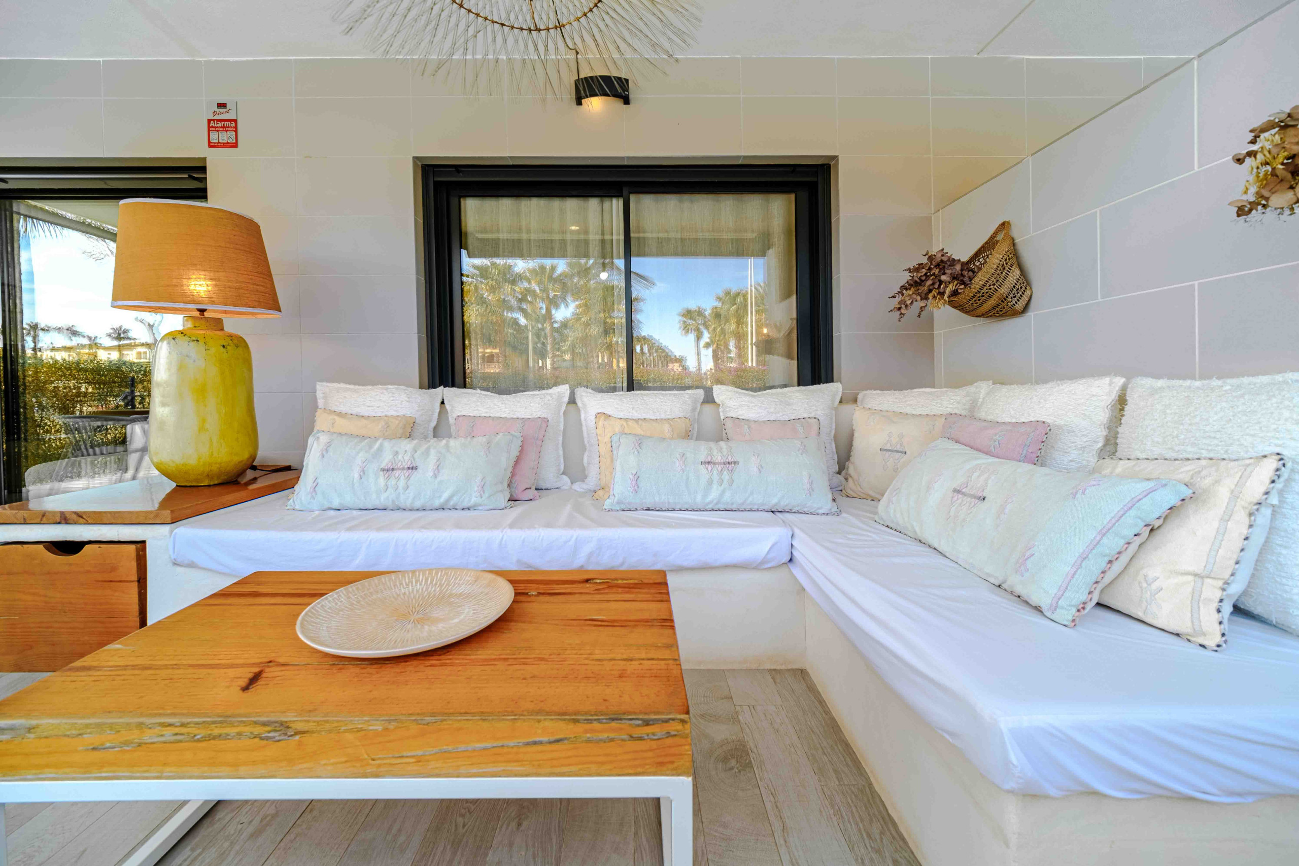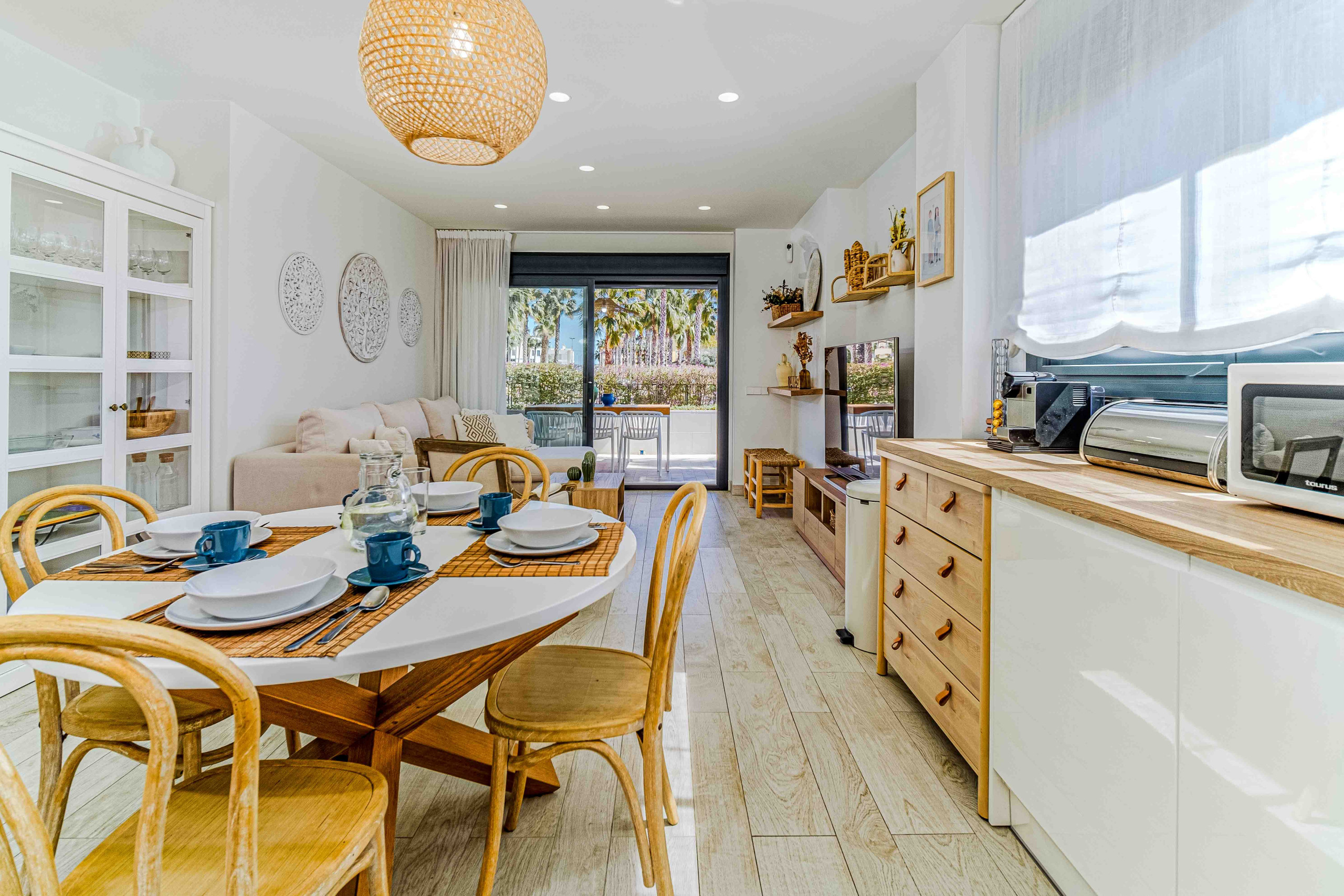 La conception du logement se caractérise par sa distribution sur un seul niveau, offrant ainsi commodité et accessibilité. L'entrée de la maison donne sur une terrasse avec une zone pour enfants, fournissant un espace sûr et agréable. De plus, elle dispose d'une cuisine américaine moderne entièrement équipée, comprenant un lave-vaisselle, un lave-linge séchant et une zone de salle à manger. Le grand salon offre un canapé confortable, un fauteuil et une grande TV à écran plat, ainsi qu'une connexion WiFi gratuite. Les portes doubles du salon s'ouvrent sur une terrasse spacieuse, idéale pour profiter de repas en plein air et se détendre, avec un accès direct à la magnifique piscine partagée située juste en face de l'appartement. Les zones communes de la résidence comprennent une belle pelouse et une grande piscine pour adultes, ainsi qu'une piscine plus petite spécialement conçue pour les enfants, garantissant ainsi le plaisir de toute la famille pendant leur séjour.