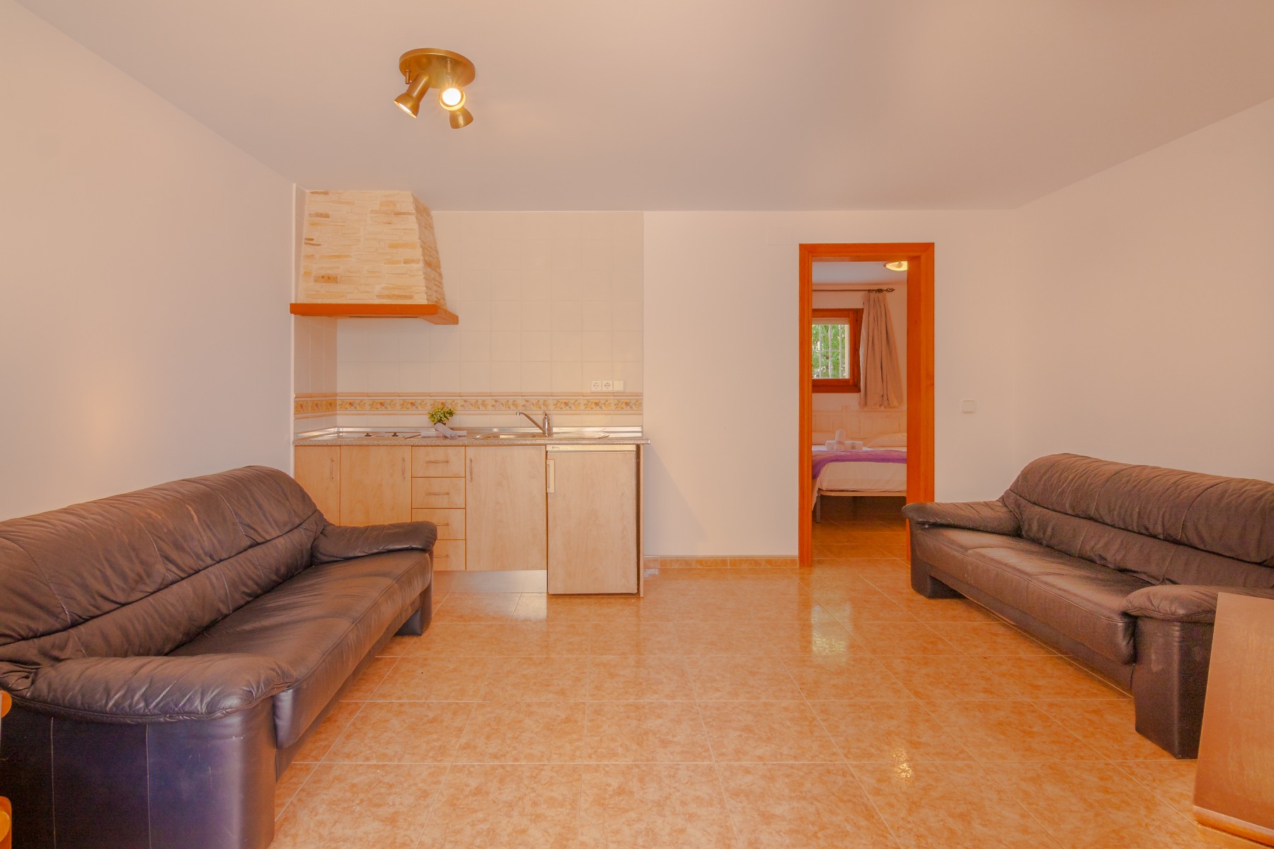 In de hoofdwoning, die zich op de eerste verdieping van het huis bevindt en bereikbaar is via een trap met 15 treden, vinden we een woonkamer met decoratieve open haard, plafondventilator, airconditioning en toegang tot een mooi terras met vrij uitzicht en een beetje uitzicht op zee en een tafel om buiten te eten. Een volledig uitgeruste keuken, een badkamer met douche, een slaapkamer met tweepersoonsbed en airconditioning. De tweede slaapkamer heeft een tweepersoonsbed.