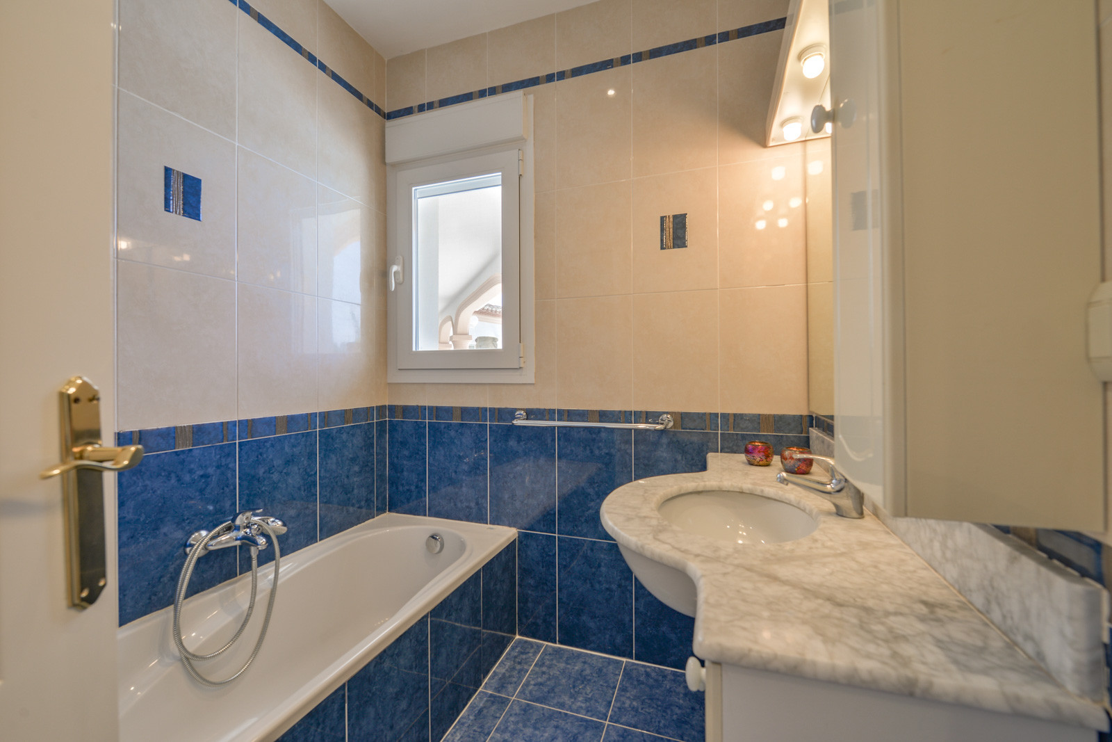 Op de begane grond en verbonden met de woonkamer door een interne trap vinden we een slaapkamer met een tweepersoonsbed en een derde slaapkamer met twee eenpersoonsbedden en een complete badkamer met een ligbad. In de gang beneden is er een airconditioning die de twee kamers op de benedenverdieping bedient.