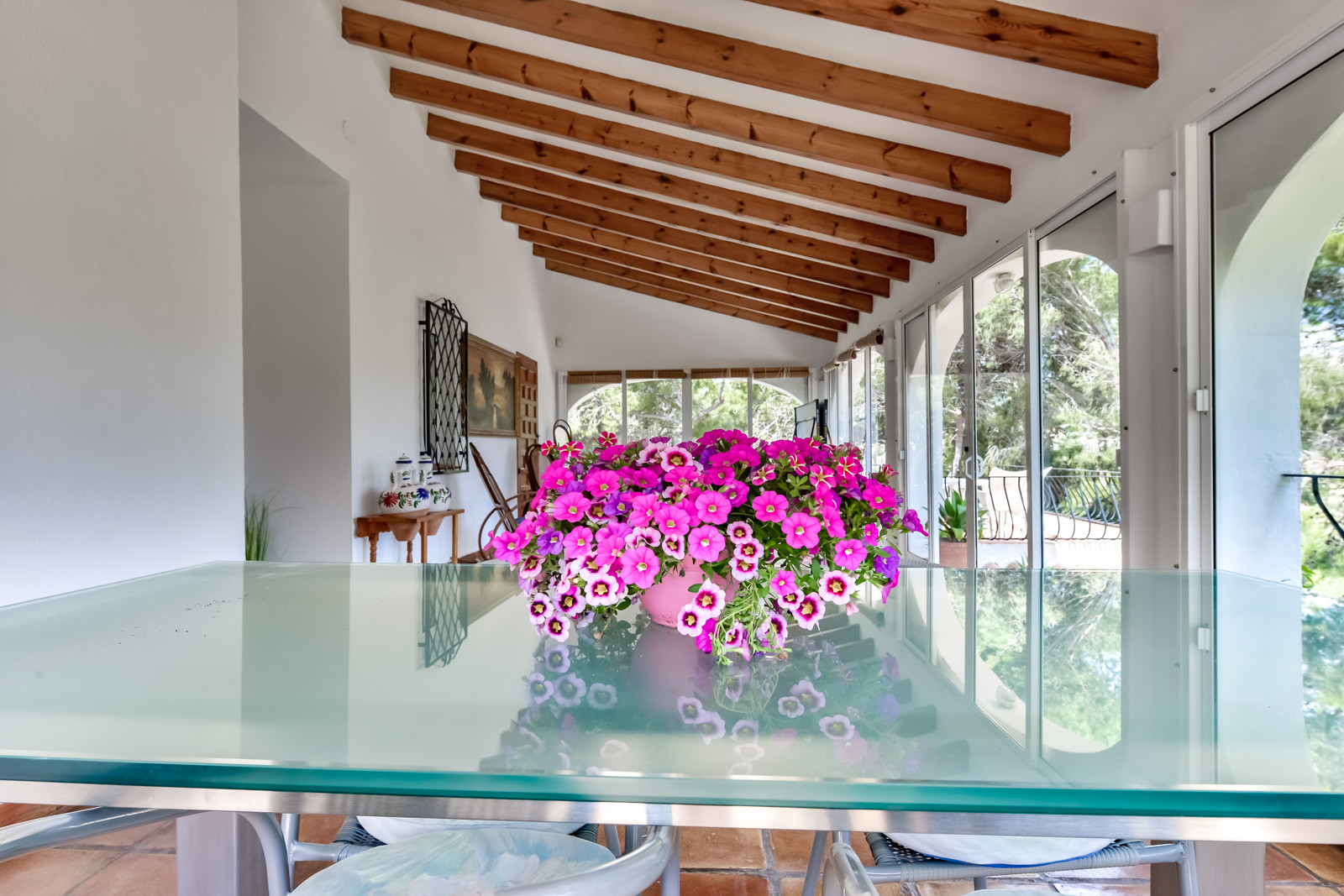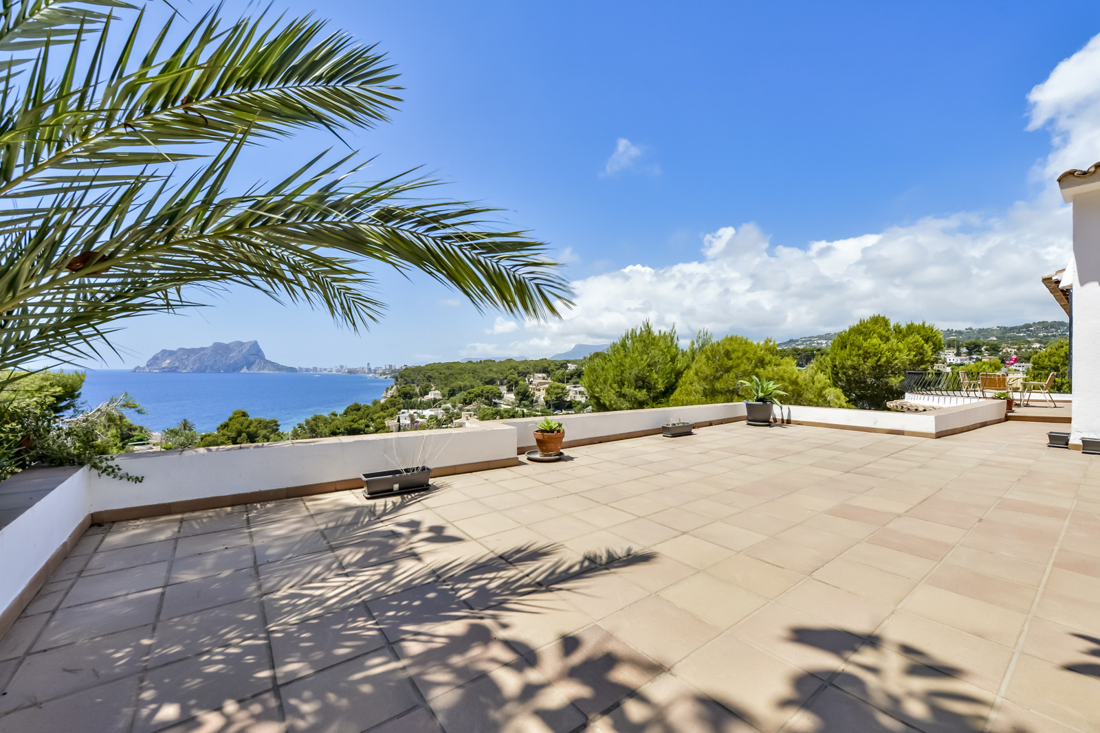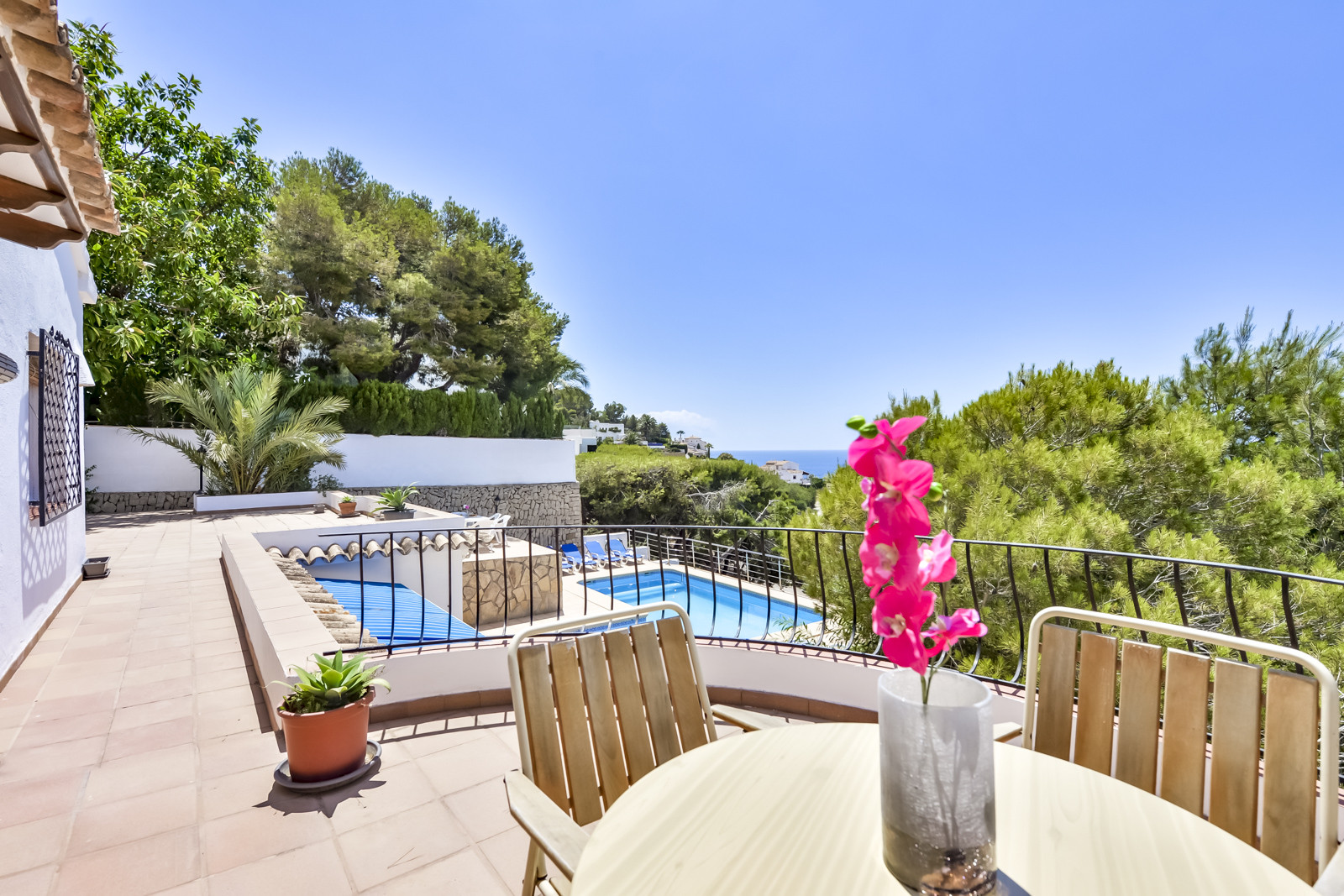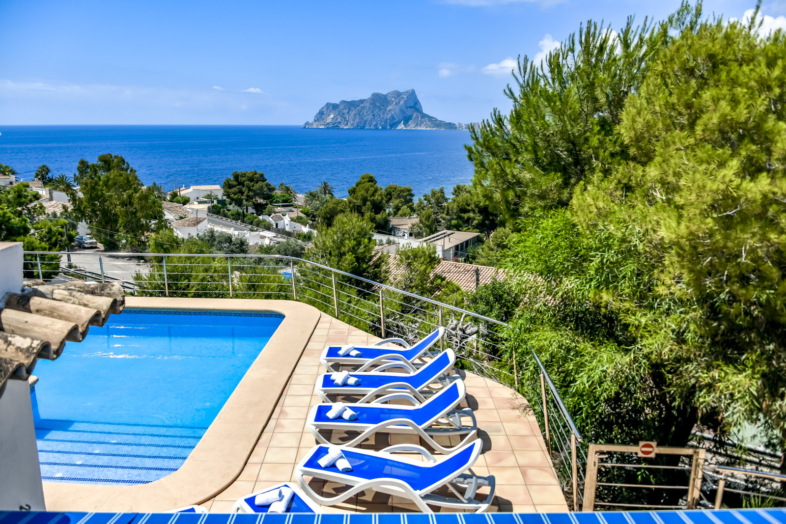 Met 1.144 m2 grond heeft de villa verschillende terrassen om buiten te eten en te dineren. Vanaf het terras op de bovenste verdieping leidt een wenteltrap naar een heerlijk solarium met buitenbanken om te ontspannen en te genieten van het prachtige uitzicht op zee vanaf een privé en zeer rustige plek, perfect voor zomeravonden. Het zwembad heeft ligstoelen om te zonnebaden, een buitendouche en een overdekte veranda. Gasbarbecue en voldoende buitenruimte voor meerdere voertuigen binnen het perceel.