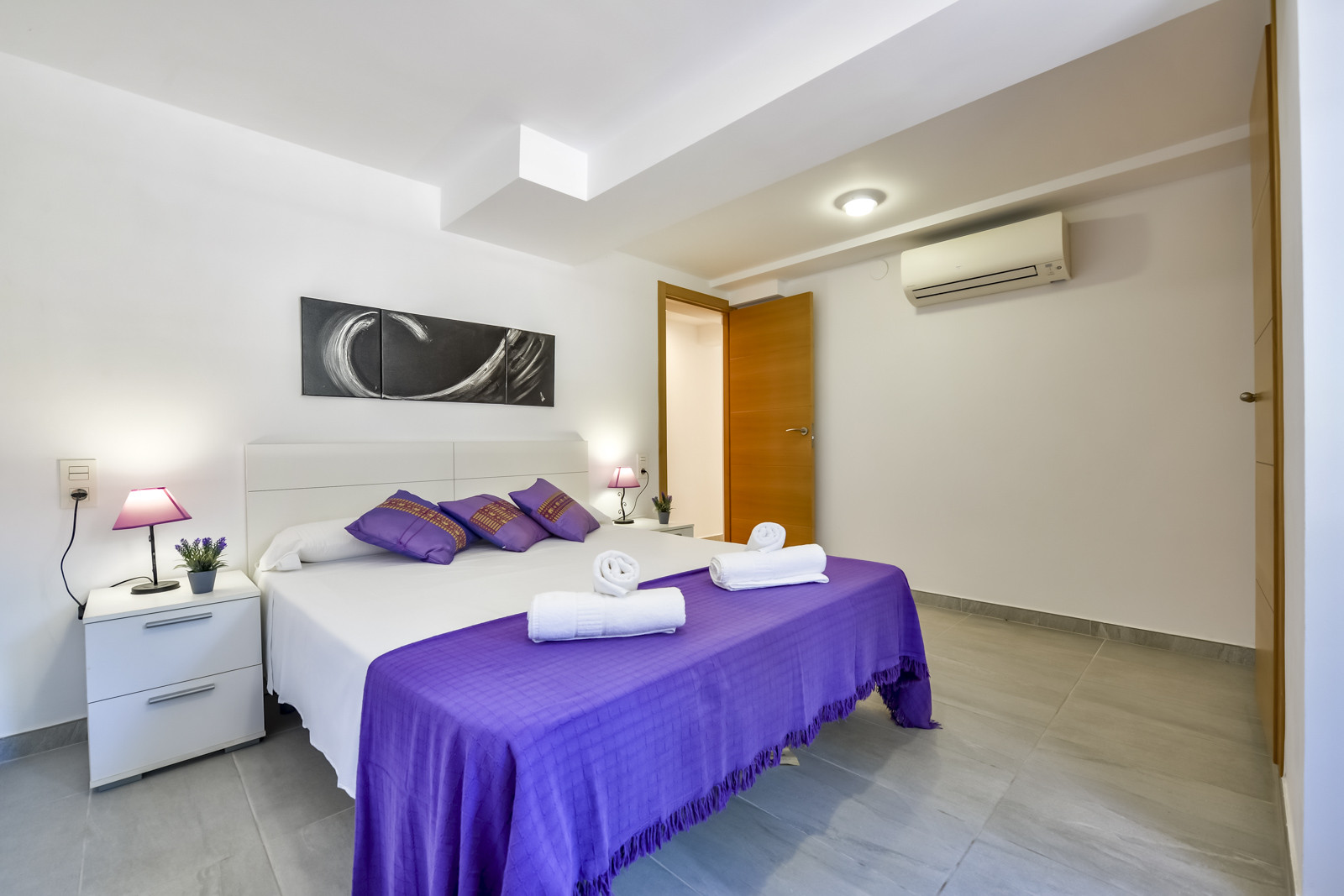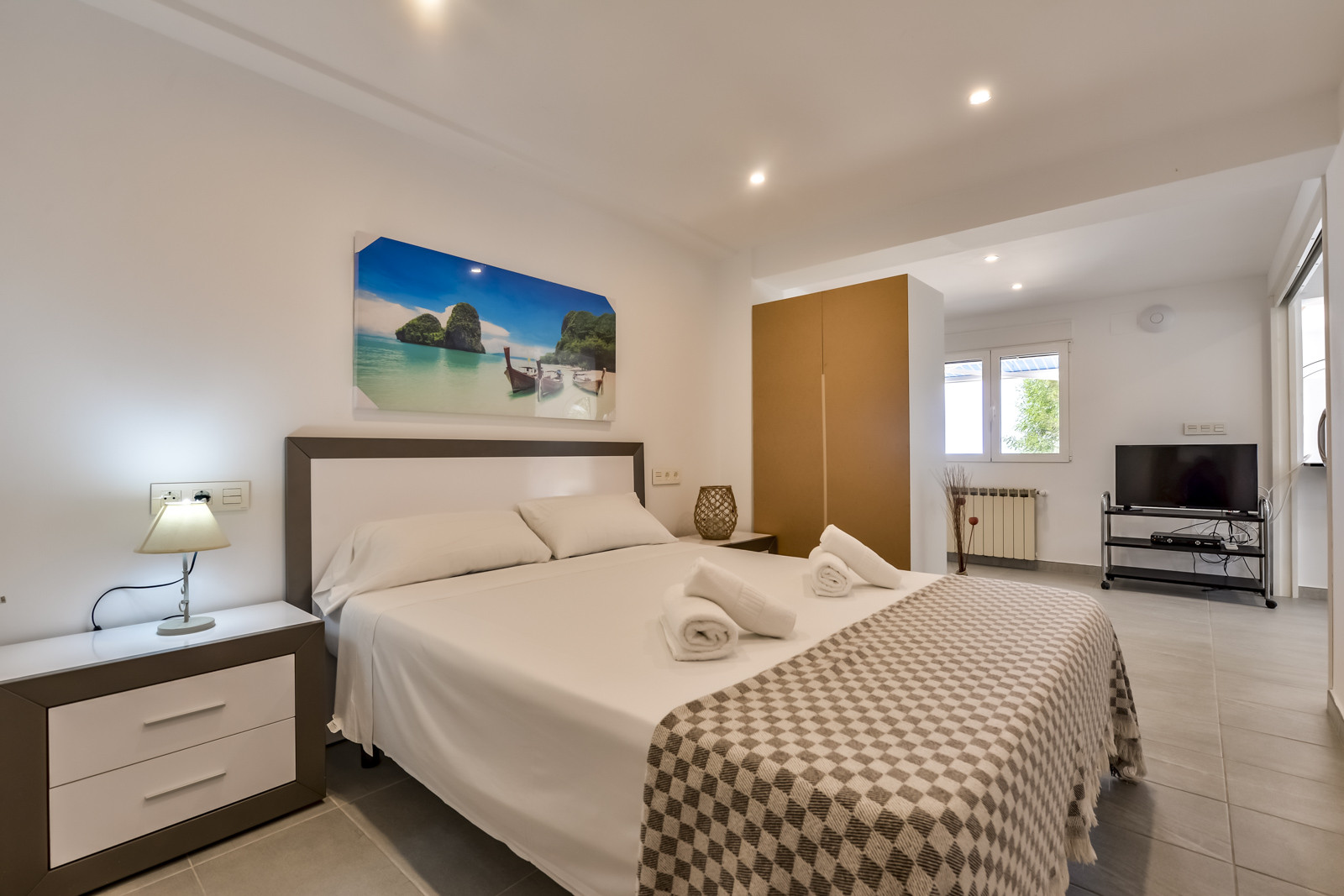 Op de onderste verdieping vinden we het tweede appartement met een open woonkamer, met bank en grote tv, airconditioning, tafel en een volledig uitgeruste kitchenette. Een slaapkamer met tweepersoonsbed en airconditioning, een badkamer met douche en een slaapkamer met twee eenpersoonsbedden en airconditioning.