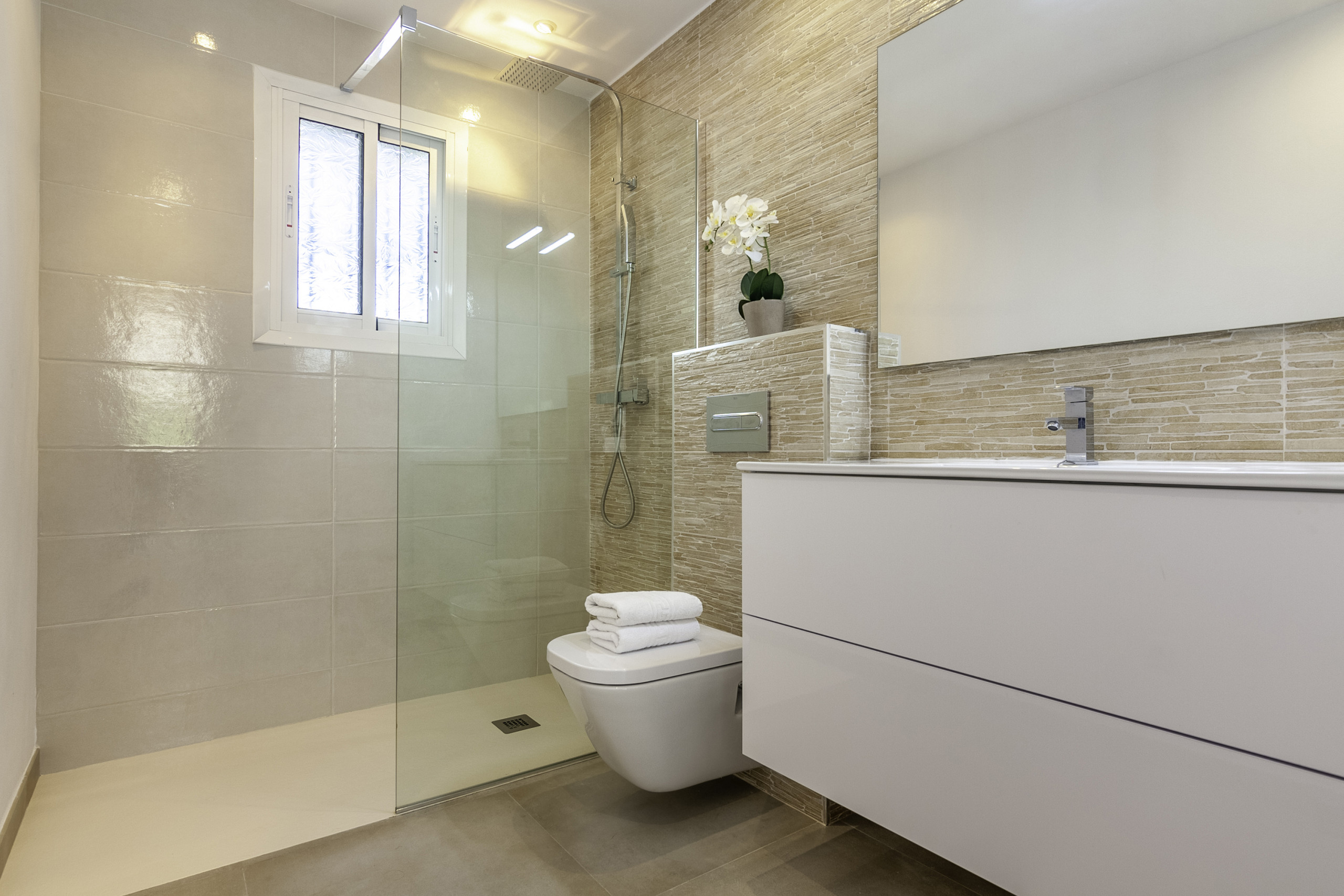 De villa heeft 120 m2 woonoppervlak en is verdeeld over één verdieping. Het eerste wat we vinden is een klein glazen terras met veel natuurlijk licht, een Amerikaanse koelkast met twee deuren, en verbonden door een boog, vinden we de woonkamer met een bank, tv-hoek en tafel voor lunch en diner, een slaapkamer met een tweepersoonsbed van 135, een tweede slaapkamer met een tweepersoonsbed (twee eenpersoonsbedden samen), de derde slaapkamer heeft ook twee eenpersoonsmatrassen samen. Een complete badkamer met ligbad, een kleine maar goed uitgeruste keuken en gecentraliseerde airconditioning in het hele huis. Vanuit de nieuw gebouwde entreehal vinden we een complete badkamer met douche en een toegang tot de vierde slaapkamer, met tweepersoonsbed en grote ramen met toegang tot het zwembad en het terras.