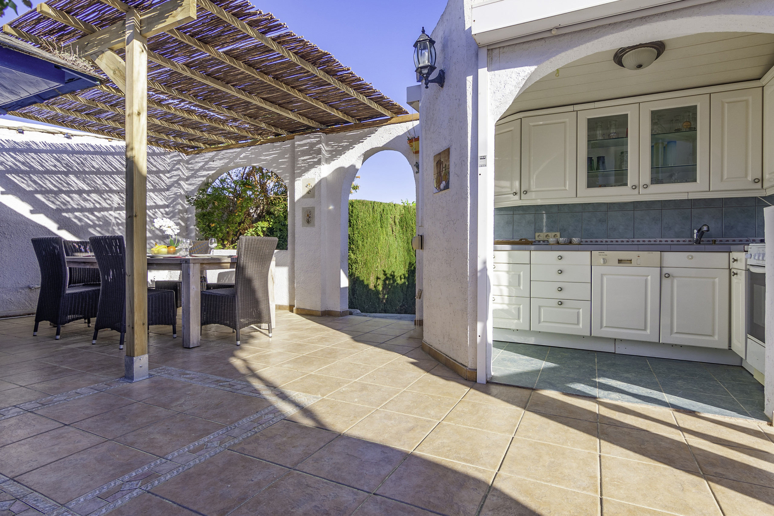 Binnen het perceel kunt u een voertuig parkeren. De villa heeft een eigen rechthoekig 4X8 zwembad met een ingebouwde trap, omgeven door een tuin met diverse bomen en planten en een buitendouche. Aan de achterkant van de villa en bij het zwembad is de ingebouwde barbecue, een wasruimte, een badkamer met een ligbad, een kleine koelkast, een zomerkeuken op gas, met een oven, en een grote tafel om te kunnen genieten met het hele gezin, een hele fijne omgeving om de hele dag buiten de villa te genieten.