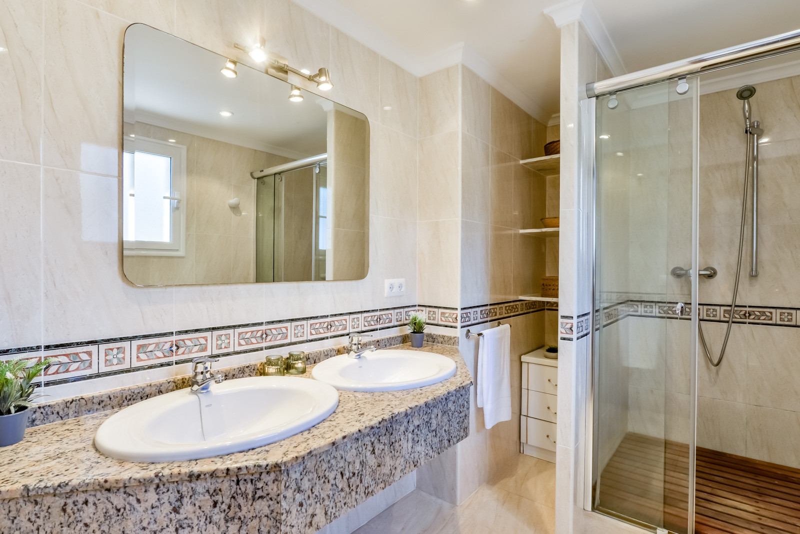 Op de begane grond en verbonden met de woonkamer door een interne trap vinden we een slaapkamer met een tweepersoonsbed en een derde slaapkamer met twee eenpersoonsbedden en een complete badkamer met een ligbad. In de gang beneden is er een airconditioning die de twee kamers op de benedenverdieping bedient.